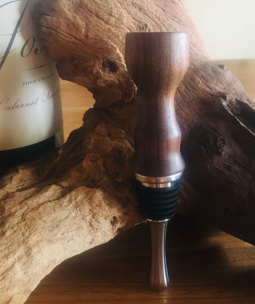 Showcase your favorite bottle of wine with this hand-turned Walnut wine glass bottle stopper.