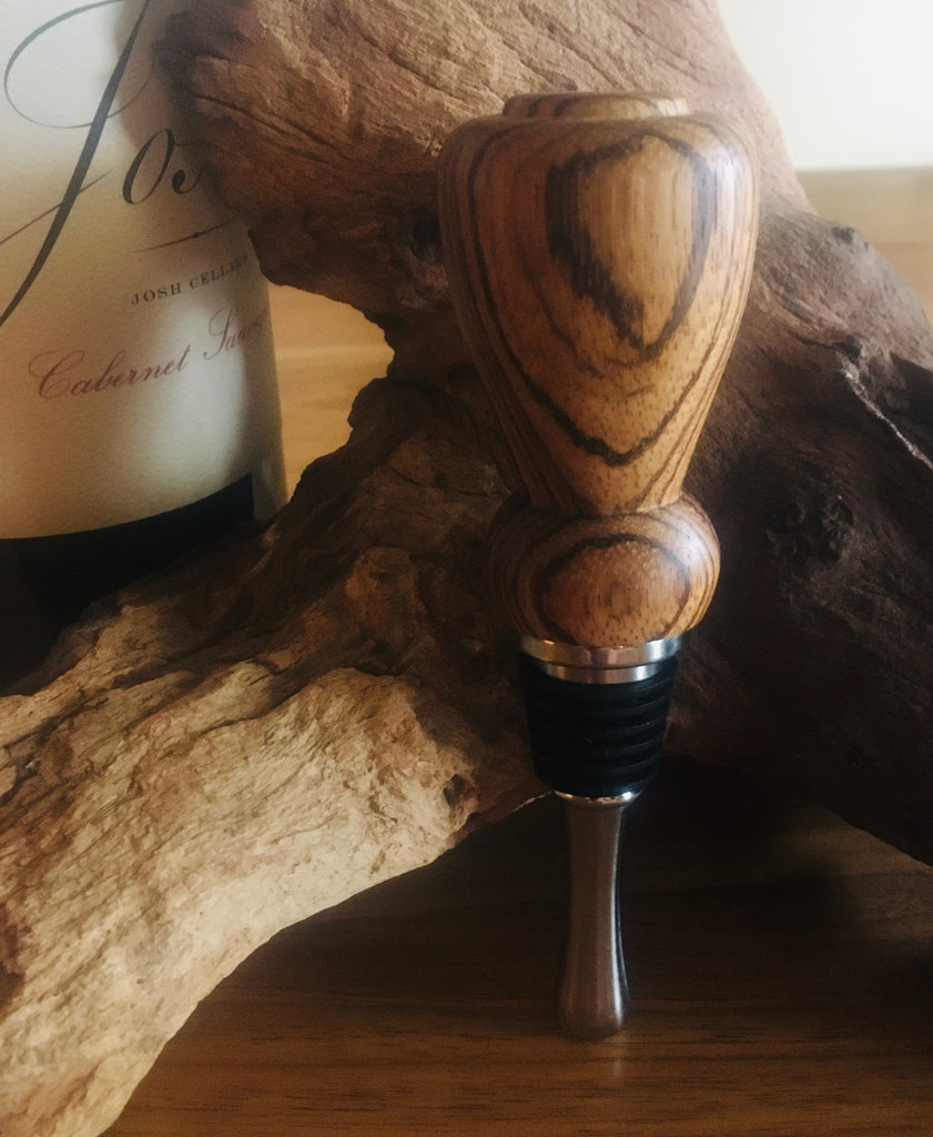 This hand-turned wine bottle stopper is made from Zebra Wood.